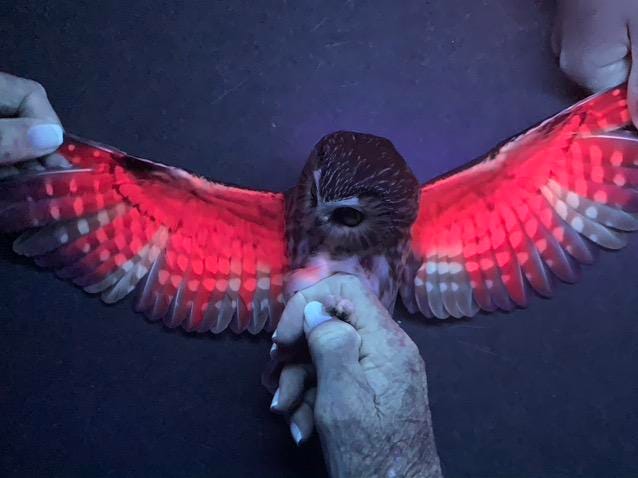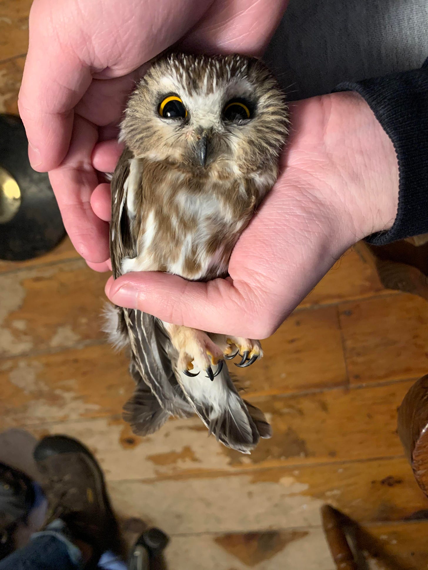 “Hi there Kate, CJ tells me you can see what is going on via her eye. I’m Alex and this is Archimedes. He’s a Northern Saw-whet Owl. You can hold him CJ yeah that’s good, like that, awesome. Ah he likes you, he’s a well behaved little guy.”