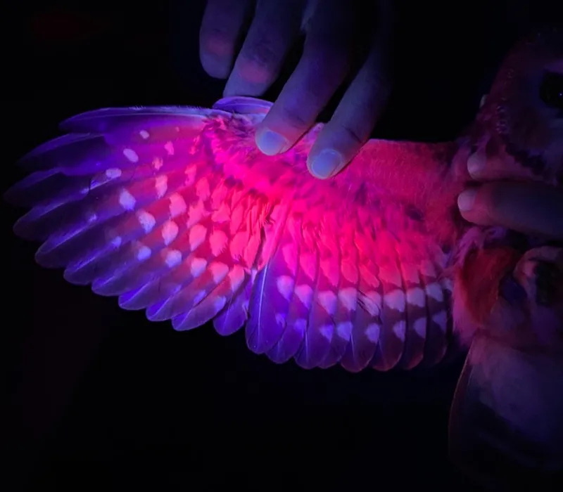 They turned off all the lights, for a second it was pitch black, blackout black and then CJ ran predator.2(). Her vision flickered for a second before switching over to the UV spectrum. The room was dark, maybe a few flickers of dark blues and greens, not much to see. Then CJ turned to look at Archimedes, as if on cue, he ruffled his feathers and spread his wings.