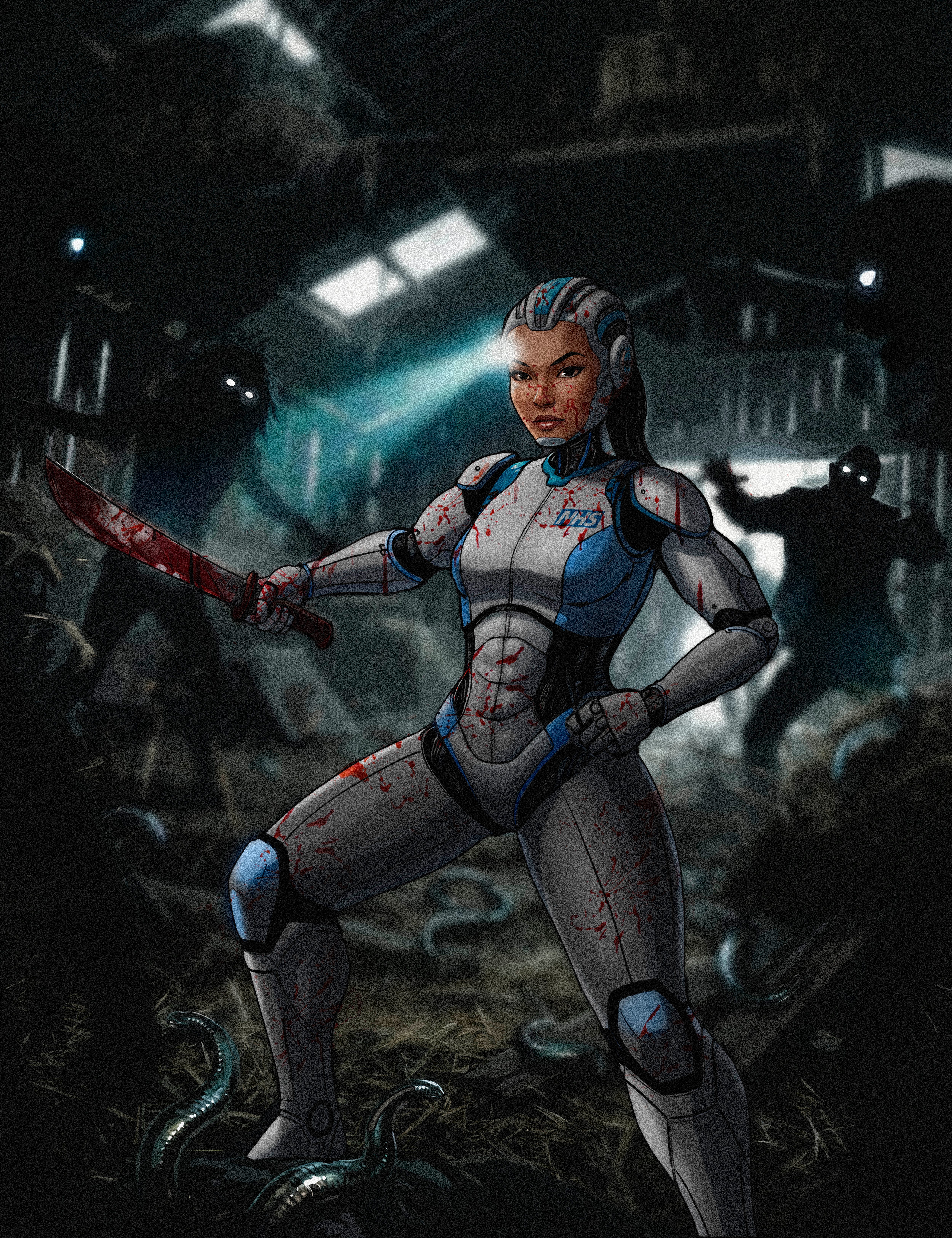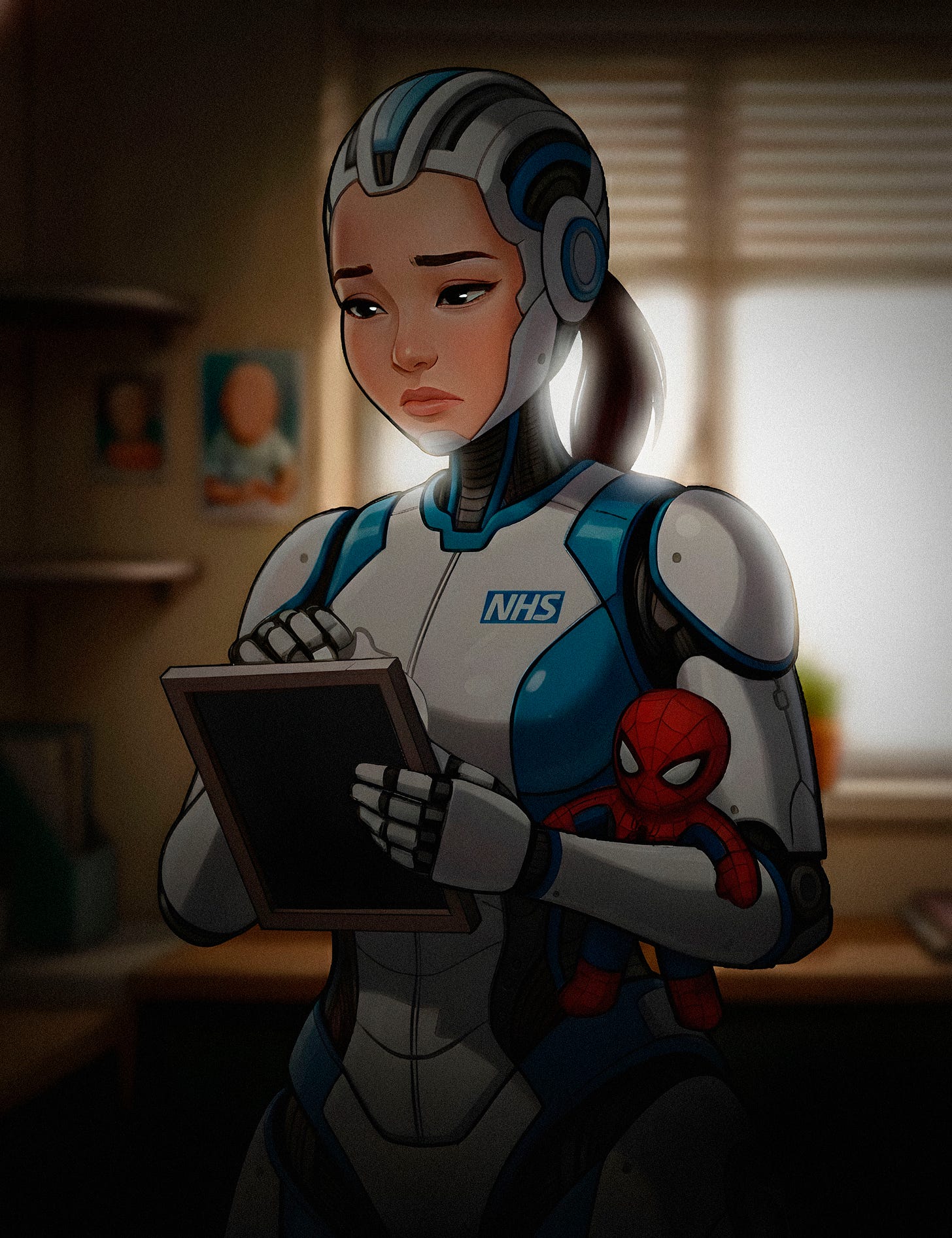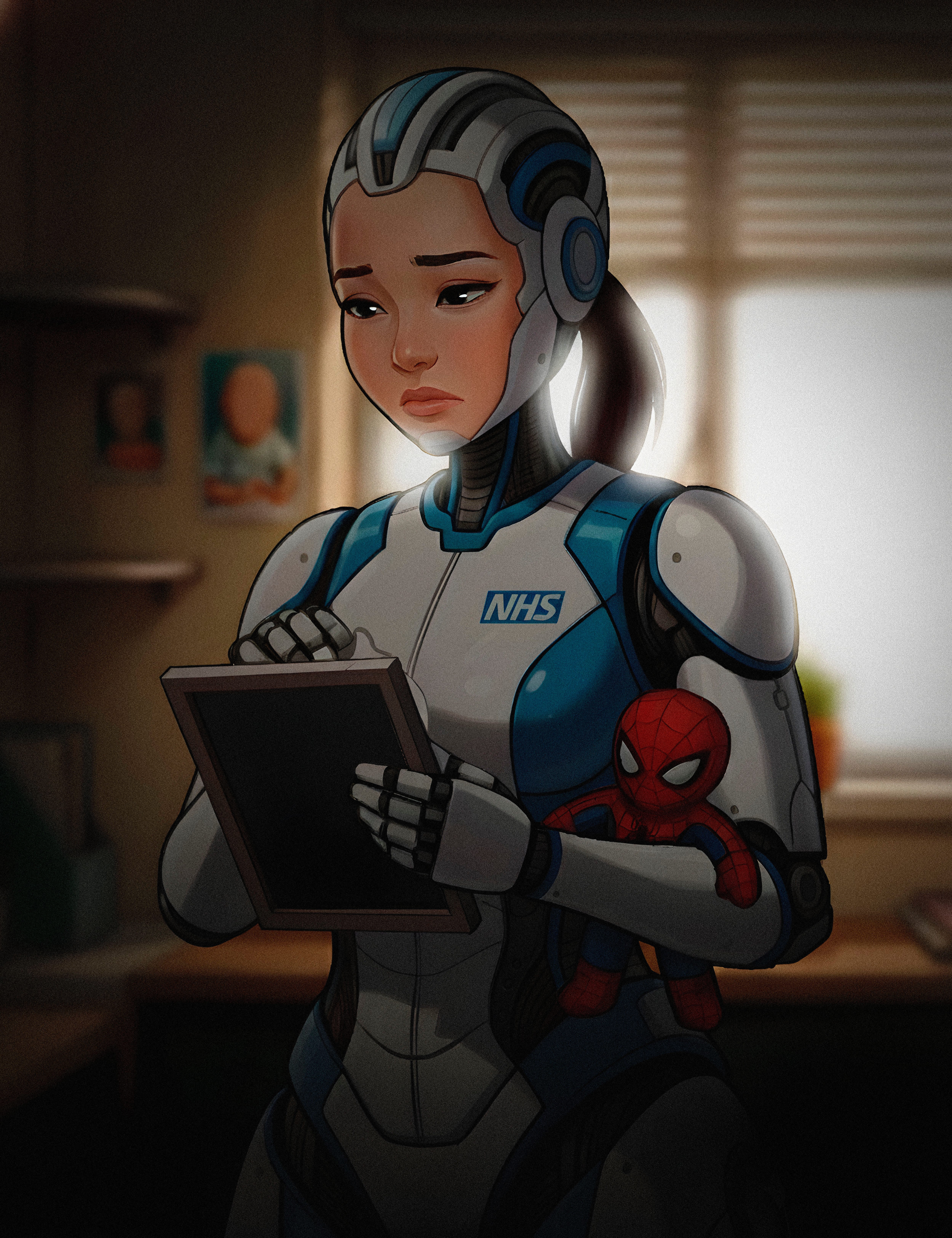 Suzy was one of the old S4 NHS Paediatric medical bots, she sprung up at once to meet them. A wide grin on her happy almost childlike but also catlike features, huge eyes and a smile full of warmth and genuine affection.
