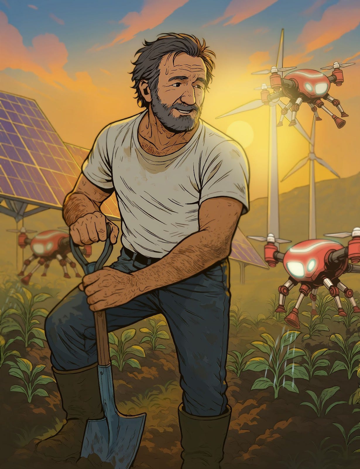 A swarm of watering drones sped by in a nearby field, tiny sparrow sized drones, all solar powered hovering over each plant, dripping water directly onto each of them so none was wasted. Moving as one, like a swarm of pollinating bees, a new ecosystem, man, machine and nature in harmony. A young lady with dreads and an AR headset was watching them, taking in the datastream, checking it was working as it should.